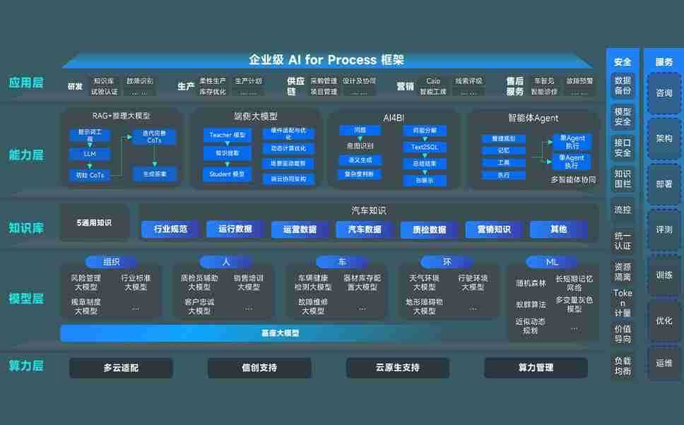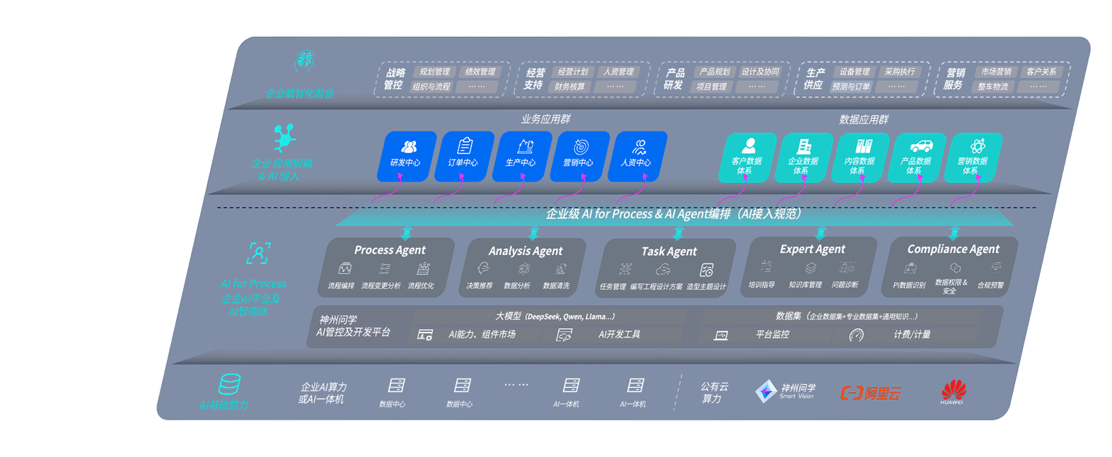 端到端的一站式AI工作空间深度融合了从企业战略规划到日常经营的全流程业务板块,,,,定向解决车企内部领域多、、、部门多、、、、链条长、、场景碎片化等难题,,支持车企快速构建以AI为核心的生产力写作体系,,,,实现任务执行与AI能力的无缝集成与交互