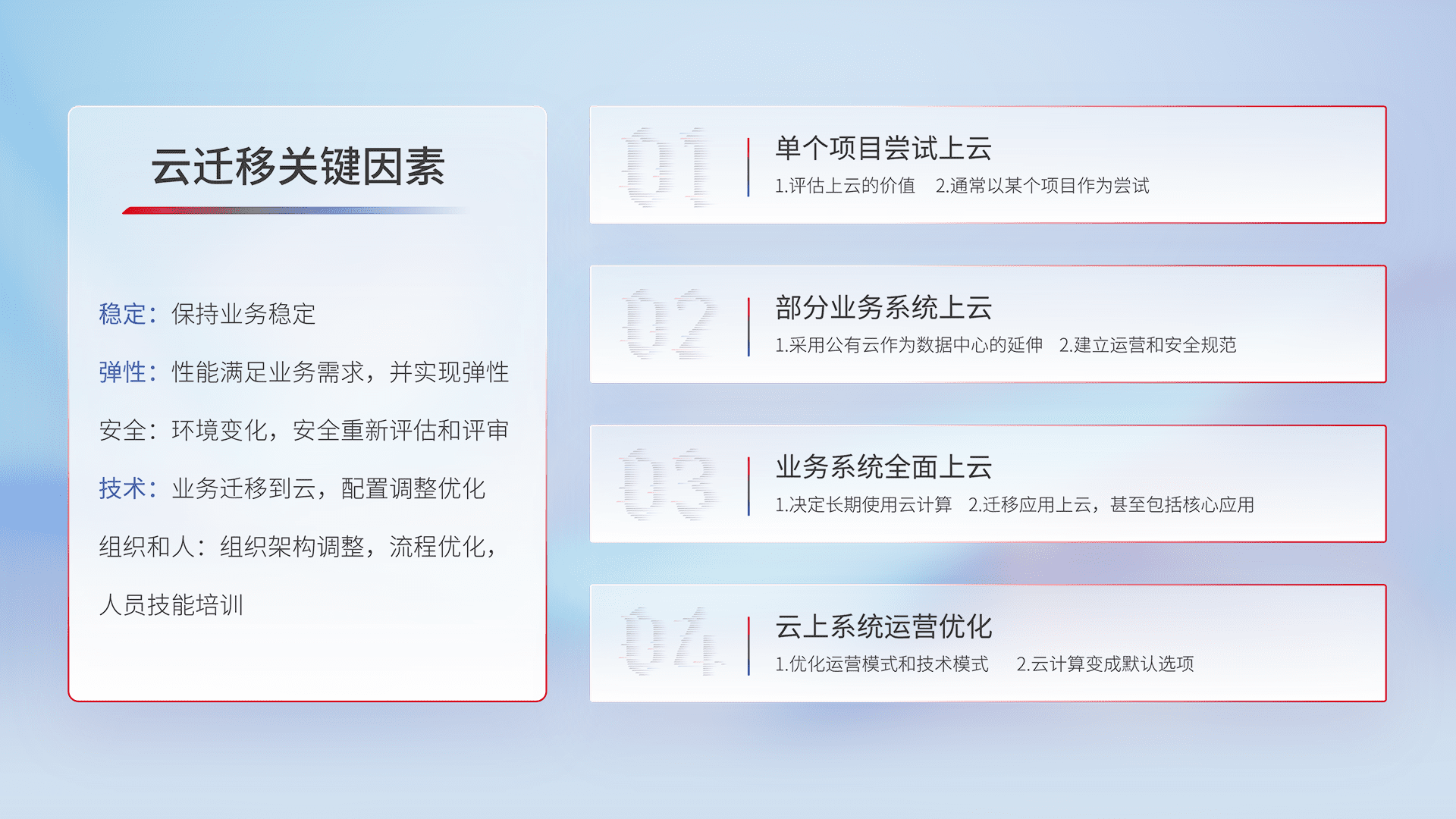 结合实际业务,,,从规划设计、、、云平台选型、、、、云原生改造、、、、数据迁移、、、、集成交付,,,迁移全过程为客户识别最佳上云路径,,做好风险识别管理,,,,设计网络架构、、、、身份权限、、、安全审计合规、、操作审计、、日志审计、、监控告警策略、、、多站点容灾设计等,,对云上基础设施进行整体规划,,提升IT治理水平,,,,以满足弹性、、高可用、、、、高性能的需求。。。
